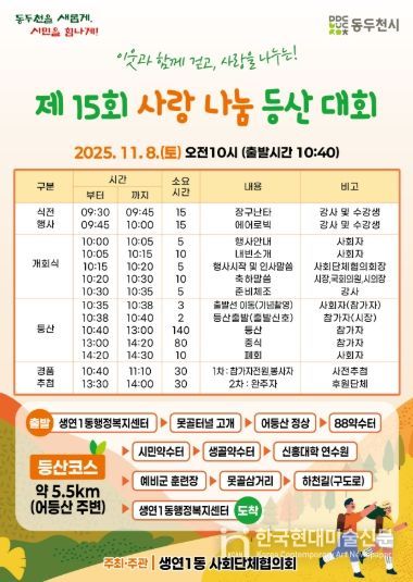 한국현대미술신문 배윤섭 기자 | 동두천시 생연1동 사회단체협의회는 오는 8일 시민이 함께하는 ‘제15회 사랑나눔 등산대회’를 개최한다고 밝혔다.