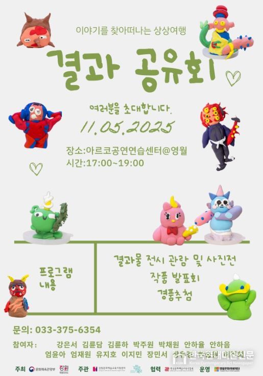한국현대미술신문 원진 기자 | 영월문화관광재단이 진행한 2025 문화예술교육사 현장역량강화사업의 목적인 문화예술교육 프로그램 ‘이야기를 찾아 떠나는 상상 여행’이 오는 11월 5일 아르코공연연습센터@영월에서 결과공유회를 개최하며 마무리될 예정이다.