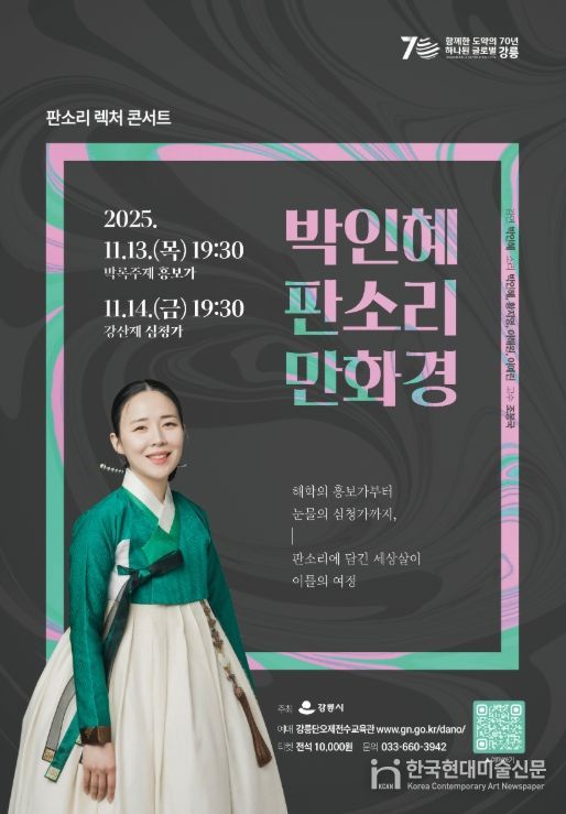 한국현대미술신문 원진 기자 | 강릉단오제전수교육관에서는 오는 13일과 14일 오후 7시 30분, 강릉단오제전수교육관 공연장에서 이틀에 걸쳐 두 가지 다른 매력의 판소리를 렉처콘서트 형식의 '박인혜 판소리만화경'을 선보인다.