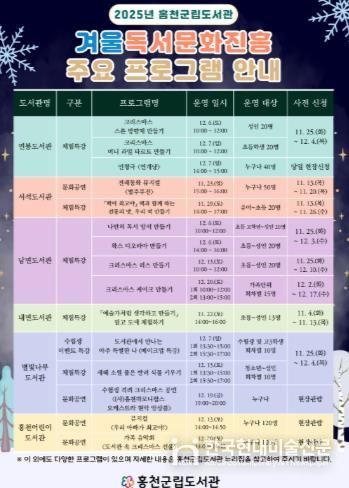 한국현대미술신문 원진 기자 | 홍천군립도서관은 겨울철 독서 의욕 고취와 도서관 이용 활성화를 위해 11월 21일부터 12월 24일까지 연봉도서관, 서석도서관, 남면도서관, 내면도서관, 별빛나루도서관, 홍천어린이도서관 등 6개 도서관에서 ‘겨울과 크리스마스’를 주제로 한 독서문화진흥 프로그램을 운영한다.