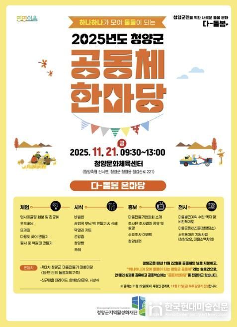 한국현대미술신문 신정은 기자 | 청양군지역활성화재단은 지역 공동체 발전을 위한 한 해의 성과를 공유하고 상호 학습을 통해 지속 가능한 발전을 도모하기 위해 ‘2025 청양군 공동체한마당’을 개최한다.