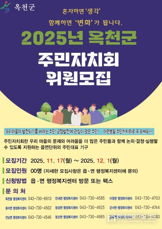 한국현대미술신문 신정은 기자 | 옥천군이 제2기 옥천군 주민자치위원의 임기가 올해 말 종료됨에 따라‘제3기 옥천군 주민자치위원’을 모집한다.