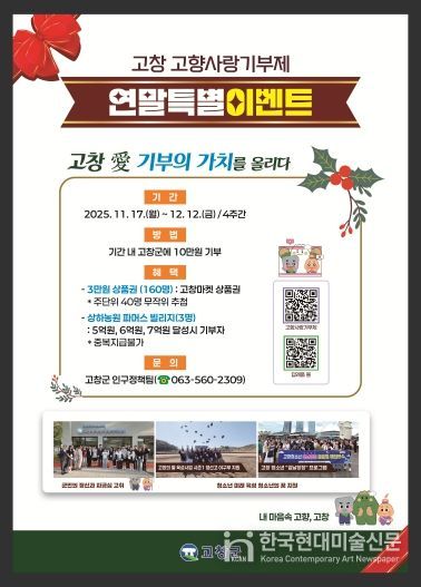 한국현대미술신문 기자 | 고창군이 연말정산 기간을 앞두고 ‘고향사랑기부제 특별이벤트-고창愛 기부의 가치를 올리다’를 12월12일까지 운영한다고 20일 밝혔다.