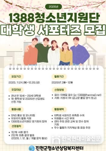 한국현대미술신문 신정은 기자 | 충북 진천군청소년상담복지센터는 이달 24일부터 대학생 대상 서포터즈 프로그램 ‘2026년 1388청소년지원단 대학생 서포터즈’ 참가자를 모집한다고 밝혔다.