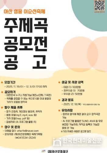 한국현대미술신문 신정은 기자 | (재)아산문화재단은 '아산 성웅 이순신축제'의 주제곡 공모전을 개최한다고 밝혔다.
