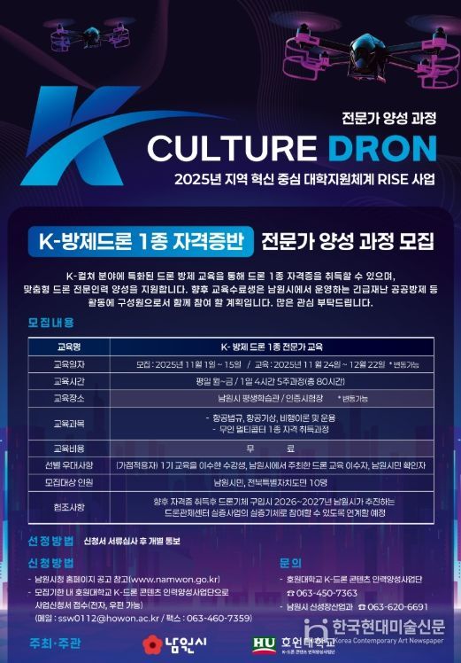 한국현대미술신문 기자 | 남원시는 지역 드론 운용·방제 등 다양한 분야에서 활동할 수 있는 전문 인력을 양성하고, 향후 지역 드론산업이 지속적으로 발전할 수 있도록 생태계를 구축하기 위해 11월 24일부터 12월 22일까지 총 21일간 ‘K-방제 드론 전문가 양성 2기 교육과정’을 운영한다.
