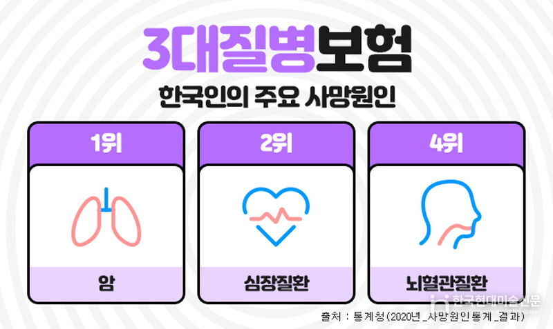 한국현대미술신문 김미정 기자 | 한국인의 주요 사망원인중에 암, 뇌혈관질환, 심혈관질환은 흔히 3대질병이라 일컬어지며 살아가면서 가장 먼저 대비해야 하는 중대질병으로 항상 강조되고 있다. 이들 질병에 미리 대비하기 위해 가입하는 것이 진단비보험인데, 이러한 3대질병진단비를 중점으로 보장하는 보장성보험이 3대진단비보험 이다. 3대질병진단비보험은 각각의 질병에 주목해서 보장하기도 하지만, 나에게 맞는 추가 특약을 잘 골라서 가입한다면 종합건강보험으로도 충분히 활용도가 높다.