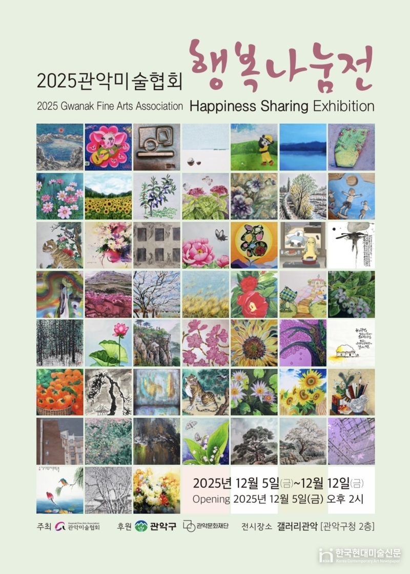 사단법인 한국미술협회 관악지부(관악미술협회)가 주관하는 ‘제10회 행복나눔 전시회’가 오는 12월 5일(금)부터 12일(금)까지 관악구청 내 갤러리 관악에서 열린다. ‘예술을 통한 나눔’을 표방하며 이어져 온 행복나눔전은 올해로 10회를 맞으며, 지역 예술계에서 ‘가장 따뜻한 연말행사’로 자리잡았다.