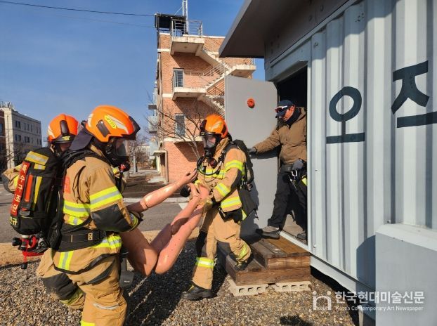 훈련은 컨테이너 암실 장애물 극복 훈련장에서 진행됐으며, 화재로 건물 내부 전원이 차단되고 농연이 확산된 상황을 가정해, 시야 확보가 제한된 상태에서 인명 구조와 신속대응팀(RIT) 투입 절차를 실전처럼 수행했다.