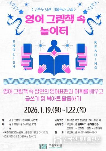 한국현대미술신문 배윤섭 기자 | 김포시 고촌도서관은 오는 2026년 1월 19일부터 1월 22일까지 초등학생 3~4학년을 대상으로 겨울독서교실 '영어 그림책 속 놀이터'를 운영한다.