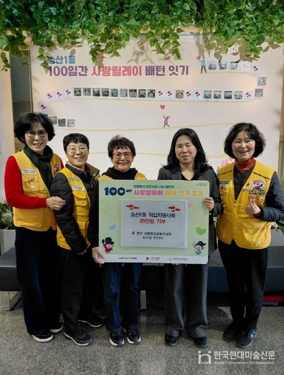 한국현대미술신문 배윤섭 기자 | 의정부시 송산1동주민센터는 12월 2일 대한적십자사 송산1동적십자봉사회가 ‘100일간 사랑릴레이 배턴 잇기’에 동참해 사랑의 성금 20만 원을 기탁했다고 밝혔다.