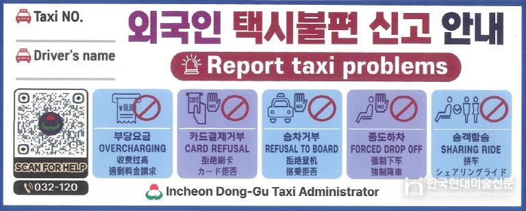 한국현대미술신문 박재남 기자 | 인천 동구는 외국인 관광객을 대상으로 한 불법 택시 영업을 근절하고 이용 편의를 높이기 위해‘불편 신고 QR스티커’를 택시에 부착한다고 밝혔다.
