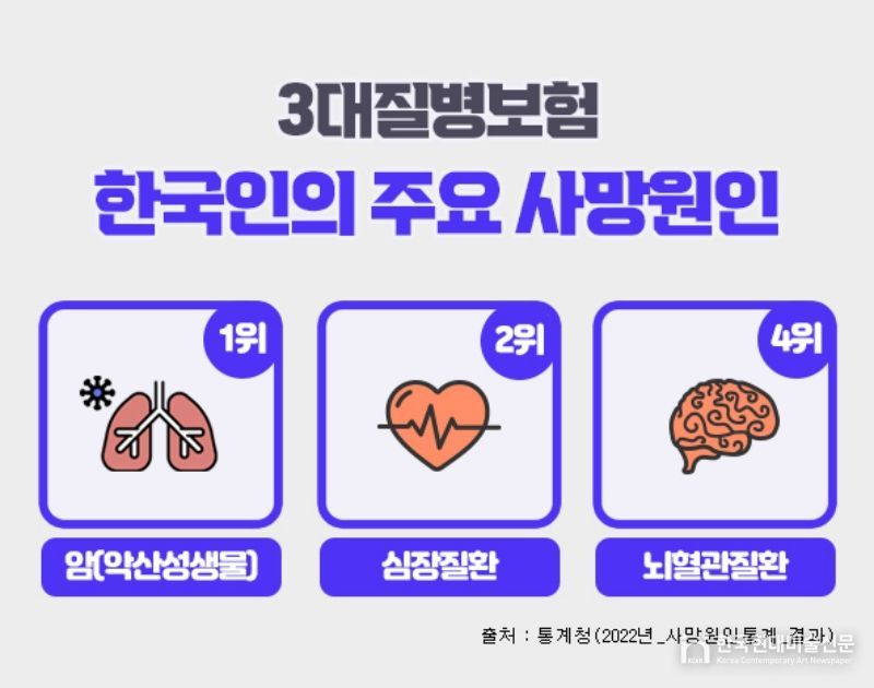한국현대미술신문 김미정 기자 | 흔히 3대질병이라 일컫는 암, 심혈관질환, 뇌혈관질환은 통계청 발표자료에 따르면 한국인의 주요 사망원인 중에서 3위 폐렴을 제외하고 1~4위를 차지하고 있으며, 이전부터 지금까지도 살면서 가장 먼저 대비해야 하는 치명적인 질병으로 강조되고 있다. 이러한 중대질병에 대비하기 위하여 상기 세가지 치명적인 질병을 집중보장하는 3대질병진단비보험을 많이 가입하고 있다. 3대진단비보험은 각각의 질병을 중점적으로 보장하면서도 가입자 특성에 맞는 특약을 추가함으로써 종합건강보험으로도 활용할 수가 있다.