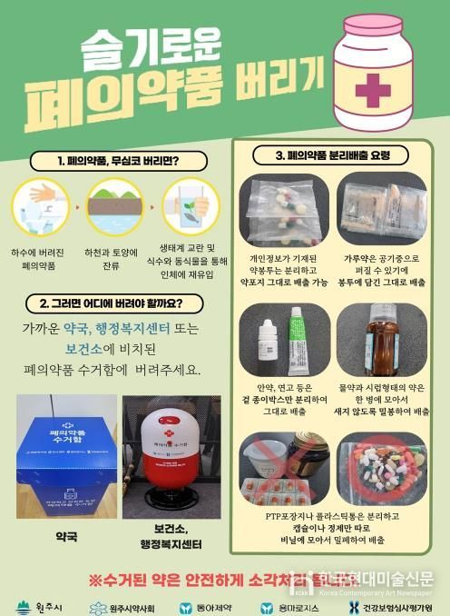 한국현대미술신문 원진 기자 | 원주시는 가정에서 배출되는 유통기한 지난 폐의약품을 안전하게 처리하기 위하여 올바른 분리배출 방법 홍보에 나섰다.