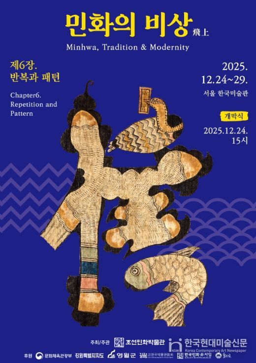 이번 여섯 번째《민화의 비상 - 반복과 패턴》展은 예년과 같이 역대 ‘전국 민화 공모전’ 수상자 단체인 ‘민수회’ 회원과 전국의 민화 작가들을 대상으로 공모와 평가로 선정된 출중한 실력을 지닌 36인의 새로운 작품과 조선민화박물관 소장품 중 반복과 패턴이 극대화된 전통 민화를 함께 선보인다.