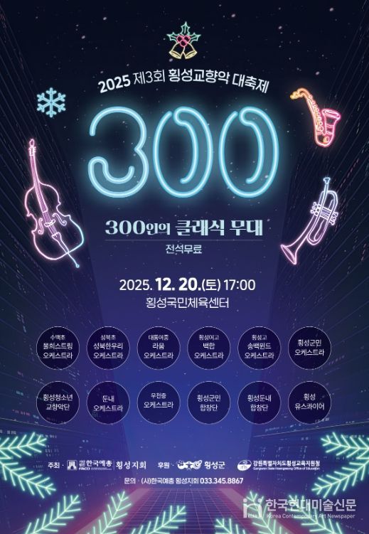 올해로 세 번째를 맞는 이번 대축제는 초등학생부터 청소년, 성인까지 세대를 아우르는 300명이 넘는 연주자와 합창단원이 함께 만드는 대규모 클래식 공연으로, 지역 예술교육의 성과와 공동체 문화의 힘을 한자리에서 보여주는 횡성의 대표적인 음악 축제다.