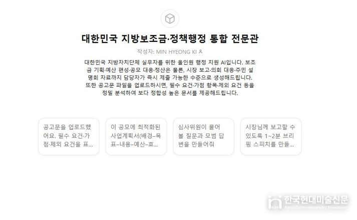 영예의 대상은 조양동주민센터 민형기 행정팀장이 차지했다. 민 팀장은 ‘대한민국 지방보조금 정책 행정 통합 전문관’ 작품을 통해 복잡한 지방보조금 업무를 AI로 통합 관리·효율화하는 모델을 제시해 심사위원들의 높은 평가를 받았다. 대상 수상자에게는 시장 표창과 함께 50만 원의 상금이 수여된다.