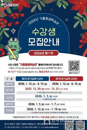 한국현대미술신문 배윤섭 기자 | 용인특례시 기흥평생학습관은 29일부터 31일까지 생성형 인공지능(AI), 웃음치료사, 영어 등 ‘2026년 제1차 정기·장기교육’ 수강생을 모집한다고 21일 밝혔다.