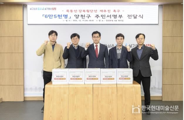 한국현대미술신문 배건 기자 | 양천구는 ‘목동선 및 강북횡단선 재추진 촉구’ 주민 서명운동을 완료하고, 6만 5천 명의 서명부를 모아 지난 17일 전달식을 개최하며 본격적인 대외 건의 활동에 나선다고 밝혔다.