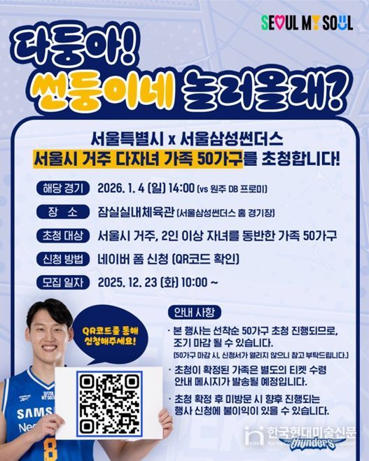 한국현대미술신문 배건 기자 | 서울시가 2026년 새해를 맞아 1월 4일 오후 2시 잠실실내체육관(송파구 올림픽로 25)에서 열리는 서울시 연고 구단 ‘서울삼성썬더스농구단’의 홈경기에 다자녀 50가족을 무료 초청한다.