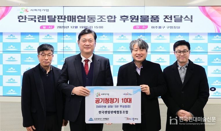 한국현대미술신문 박재남 기자 | 인천 미추홀구는 지난 19일 사회적기업 한국렌탈판매협동조합(대표 정영이)으로부터 공기청정기 10대를 전달받았다.