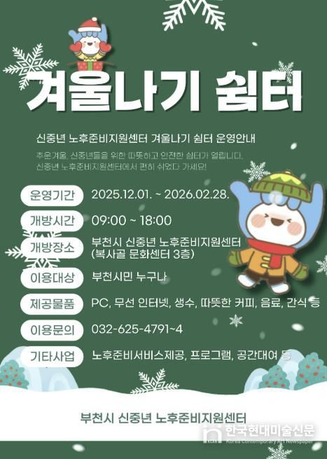 한국현대미술신문 배윤섭 기자 | 부천시는 내년 2월 28일까지 한파에 대비해 시민들이 안전하게 머물 수 있도록 ‘부천시 신중년 노후준비지원센터’를 겨울나기 쉼터로 개방해 운영하고 있다고 22일 밝혔다.