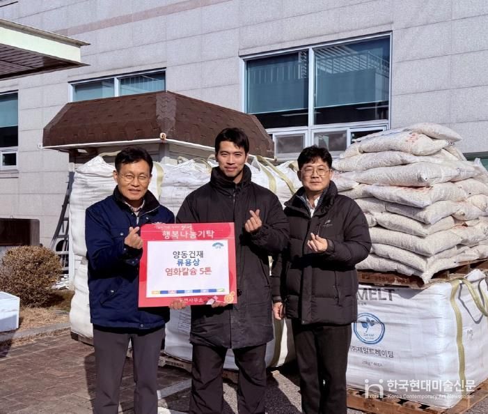 한국현대미술신문 배윤섭 기자 | 양평군 양동면은 지난 19일 양동건재 류용상 씨가 양동면사무소를 방문해 겨울철 제설작업에 사용될 염화칼슘 5톤을 기탁하며 지역사회 안전과 이웃사랑 실천에 동참했다고 밝혔다.