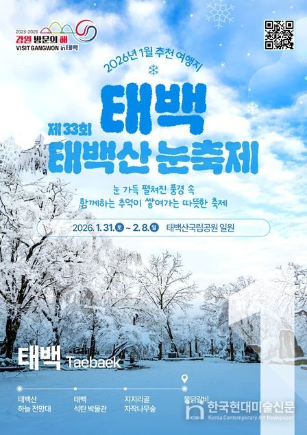 한국현대미술신문 원진 기자 | 강원특별자치도와 강원관광재단은 ‘2026 강원 방문의 해’ 1월 추천 여행지로 태백시와 홍천군을 선정하여 대대적인 홍보마케팅을 추진한다고 밝혔다.