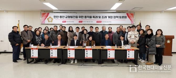 한국현대미술신문 배윤섭 기자 | 안양시의회 김경숙 의원(국민의힘, 석수1·2동·충훈동)은 12월 24일 시의회 소회의실에서 '만안·동안 균형발전을 위한 용적률 특례 및 조례 개정 정책토론회'를 개최하고, 만안과 동안 간 개발 격차 해소를 위한 다양한 정책 대안을 논의했다.