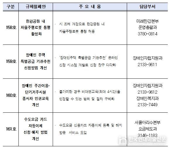 서울시는 내년 상반기 중으로 ▴한강공원 자율주행로봇 통행 허용(158호) ▴장애인주택 특별공급 기관추천 신청방법 개선(159호) ▴장애인시설 종사자 인권교육 개선(160호) ▴수도요금 카드 자동이체 개선(161호), 총 4건의 규제를 개선하겠다고 밝혔다.