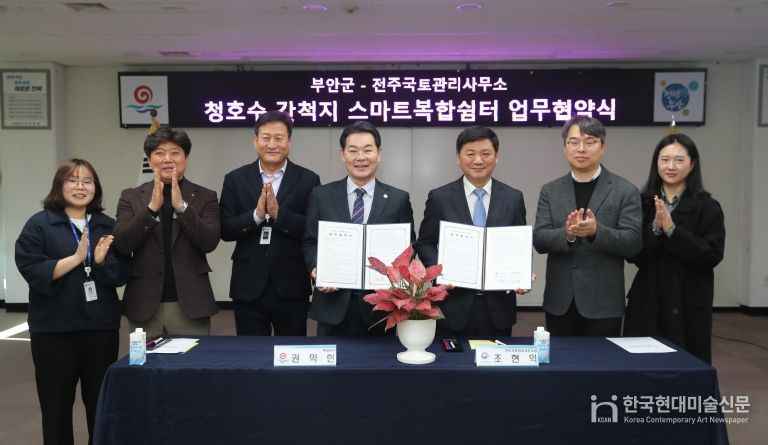 한국현대미술신문 기자 | 부안군은 익산지방국토관리청 전주국토관리사무소와 부안 청호수 간척지 스마트복합쉼터 조성사업의 원활한 추진을 위한 업무협약(MOU)을 체결했다고 밝혔다.