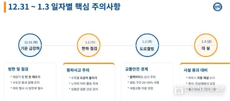 한국현대미술신문 기자 | 전북자치도는 31일 해넘이와 1월 1일 해맞이를 앞두고 기온 급강하와 대설 가능성이 있는 가운데 도민과 방문객의 안전한 연말연시를 위해 현장 안전관리에 총력을 기울인다.