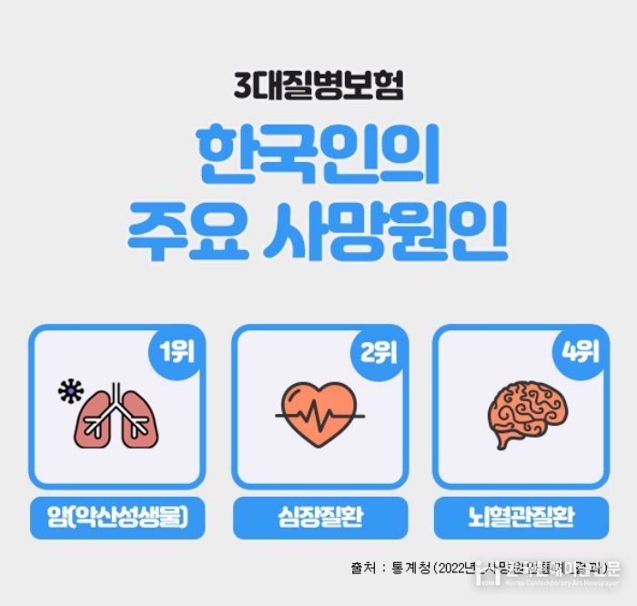 한국현대미술신문 김미정 기자 | 3대질병으로 일컬어지는 암, 뇌혈관질환, 심혈관질환은 한국인의 주요 사망원인에서 상위를 차지하고 있으며, 이에 대한 진단비를 집중적으로 보장해 주는 보험상품을 3대질병진단비 보험이라 할 수 있다.