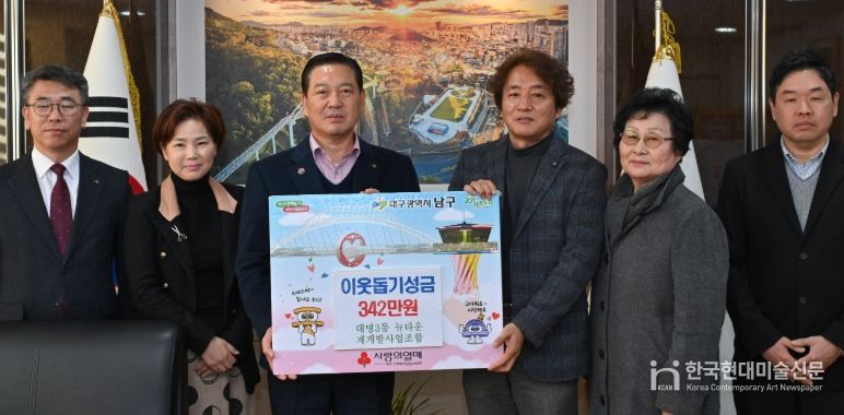 한국현대미술신문 정소영 기자 | 대구 남구는 대명3동 뉴타운 재개발사업 조합의 조합장(이대룡)을 비롯한 임원, 대의원 및 직원이 지난 2025년 12월 30일 연말을 맞아 어려운 이웃을 위해 써달라며 정성껏 모은 성금 342만원을 기탁했다고 밝혔다.