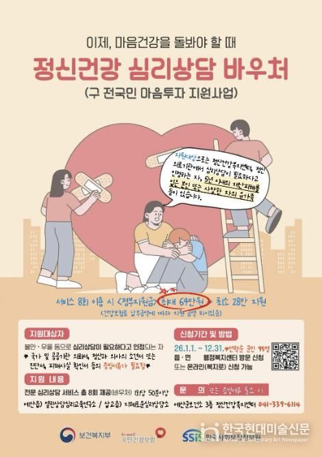 한국현대미술신문 신정은 기자 | 예산군보건소 정신건강복지센터는 우울·불안 등 정서적 어려움을 겪는 군민의 마음건강 돌봄과 정신질환 조기 발견, 자살 예방을 위해 ‘정신건강 심리상담 바우처사업’을 추진하고 있다.