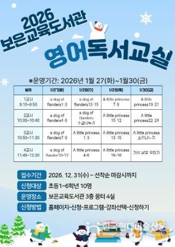 한국현대미술신문 신정은 기자 | 보은교육도서관은 겨울방학을 맞아 관내 초등학생을 대상으로 ‘그림책 독서 교실’과 ‘영어 독서 교실’을 운영한다고 밝혔다.