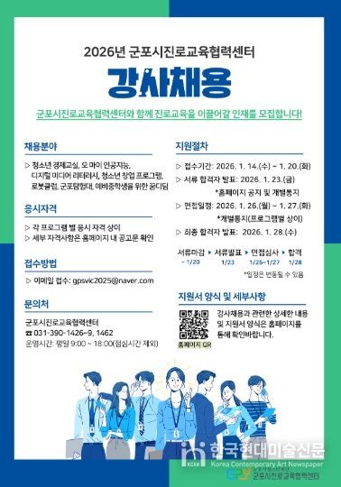 한국현대미술신문 배윤섭 기자 | (재)군포시청소년재단 군포시진로교육협력센터는 관내 청소년의 진로 탐색과 진로 역량 강화를 위해 '2026년 군포시진로교육협력센터 강사'를 채용한다고 밝혔다.