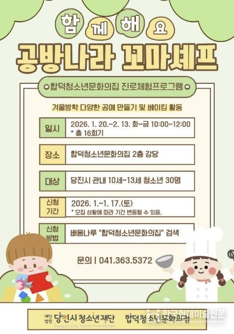 한국현대미술신문 신정은 기자 | 합덕청소년문화의집은 방학 기간 중 공방나라 꼬마셰프 진로체험프로그램 2026년 1월 20일 화요일부터 2월 13일 금요일까지 화~금 10:00~12:00 총 16회기 다양한 공예 및 베이킹 체험을 희망하는 당진시 관내 청소년 초등학생 10세~13세 30명을 모집한다.