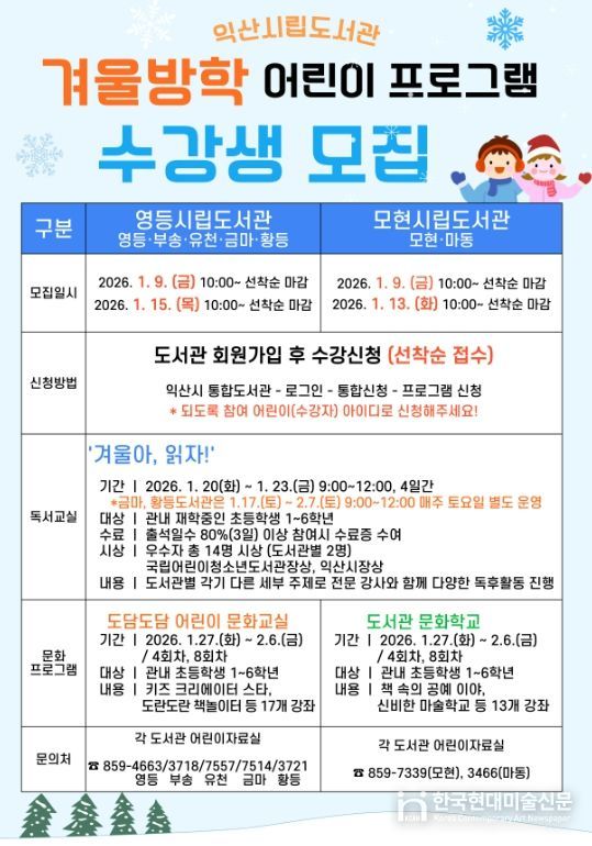 한국현대미술신문 기자 | 익산시가 겨울방학을 맞은 초등학생들을 위해 독서와 체험이 어우러진 다채로운 프로그램을 마련했다.