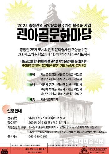 한국현대미술신문 신정은 기자 | 충주문화관광재단과 충주시는 정부의 지방시대 핵심 비전인 ‘5극 3특(5대 초광역권 및 3대 특별자치도)’ 전략에 발맞춰, 충청권역의 문화적 연대를 강화하고 지역 균형 성장을 견인할 '충청권 국악문화향유거점 활성화 사업' 운영자를 오는 21일까지 공개 모집한다.