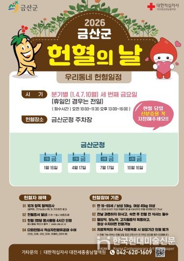 한국현대미술신문 신정은 기자 | 금산군은 올해 헌혈 참여를 독려하기 위해 지역 내에서 수혈용 헌혈을 하면 금산사랑상품권 1만 원을 지급한다.