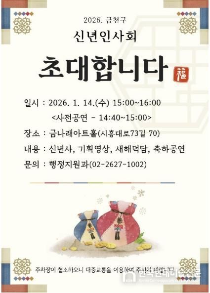 한국현대미술신문 배건 기자 | 금천구는 오는 14일 오후 3시 금나래아트홀에서 병오년(丙午年, 붉은 말의 해) 새해를 맞아 금천의 도약과 번영을 기원하는 ‘2026년 금천구 신년인사회’를 개최한다고 밝혔다.