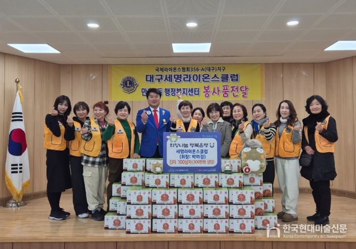 한국현대미술신문 정소영 기자 | 대구 세명라이온스클럽(회장 박미경)은 만촌1동 행정복지센터를 방문해 김치 3kg 100상자(300만 원 상당)를 후원하며 지역 이웃을 위한 따뜻한 나눔을 실천했다.