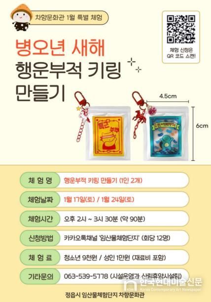 한국현대미술신문 기자 | 정읍시 임산물체험단지 내 차향문화관이 2026년 새해를 맞아 오는 17일과 24일, 온 가족이 함께 참여해 새해 소망을 비는 ‘행운 부적 키링 만들기’ 프로그램을 운영한다고 13일 밝혔다.