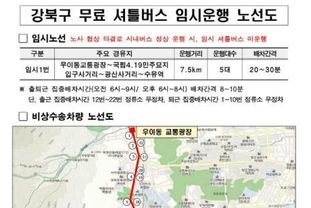 비상수송대책의 핵심으로, 구는 ‘임시 무료 셔틀버스(임시 1번)’를 운영하고 있다. 셔틀버스는 우이동 교통광장에서 수유역까지 약 7.5km 구간을 운행하며, 전세버스 10대가 투입돼 오전 6시부터 밤 10시까지 운행된다.