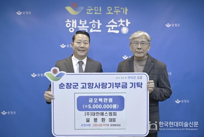 한국현대미술신문 기자 | 순창군은 12일 (주)대한에스엠피 설봉환 대표가 순창군에 고향사랑기부금 500만원을 기탁했다고 밝혔다.