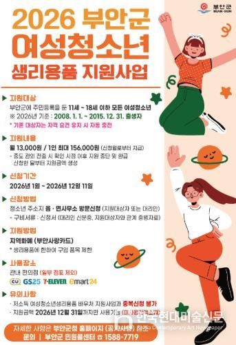 부안군 관계자는 “여성청소년 생리용품 지원은 신청한 달부터 지원받을 수 있으므로, 특히 1월 집중신청기간에 대상 청소년들이 빠짐없이 혜택을 받을 수 있기를 바란다”고 말했다.