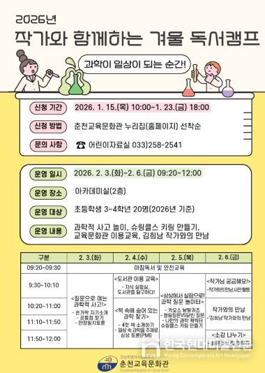 한국현대미술신문 원진 기자 | 춘천교육문화관(관장 유선종)은 겨울 방학을 맞아 오는 2월 3일부터 2월 6일까지 4일간 초등학교 3~4학년 20명을 대상으로 겨울 독서캠프를 운영한다.