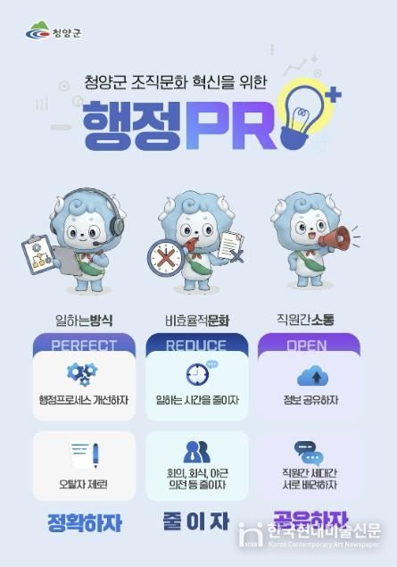 한국현대미술신문 신정은 기자 | 청양군은 조직문화 혁신과 행정 효율성 제고를 위해 더욱 고도화된 ‘행정PRO+ 운동’을 적극 추진할 계획이라고 16일 밝혔다.
