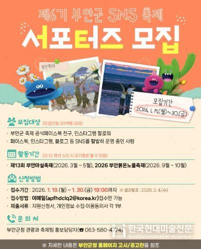 한국현대미술신문 기자 | 부안군은 오는 19일부터 30일까지 부안의 대표 축제를 홍보할 제6기 부안군 SNS 축제 서포터즈’를 모집한다.
